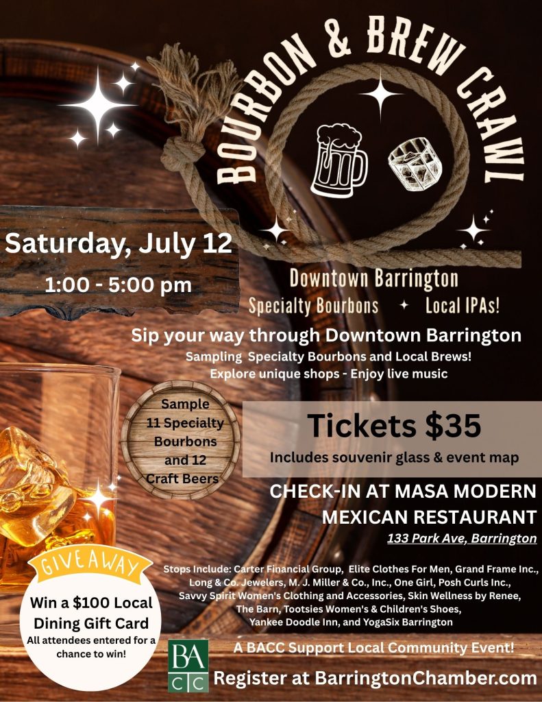Whether you’re a bourbon enthusiast, craft beer fan, or simply looking for a fun afternoon out, the Bourbon & Brew Crawl offers a great reason to explore Barrington and a perfect opportunity to stay for dinner.